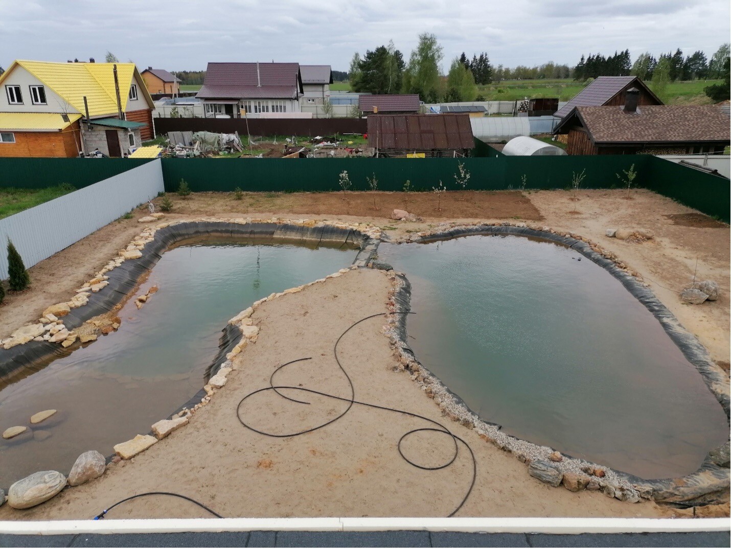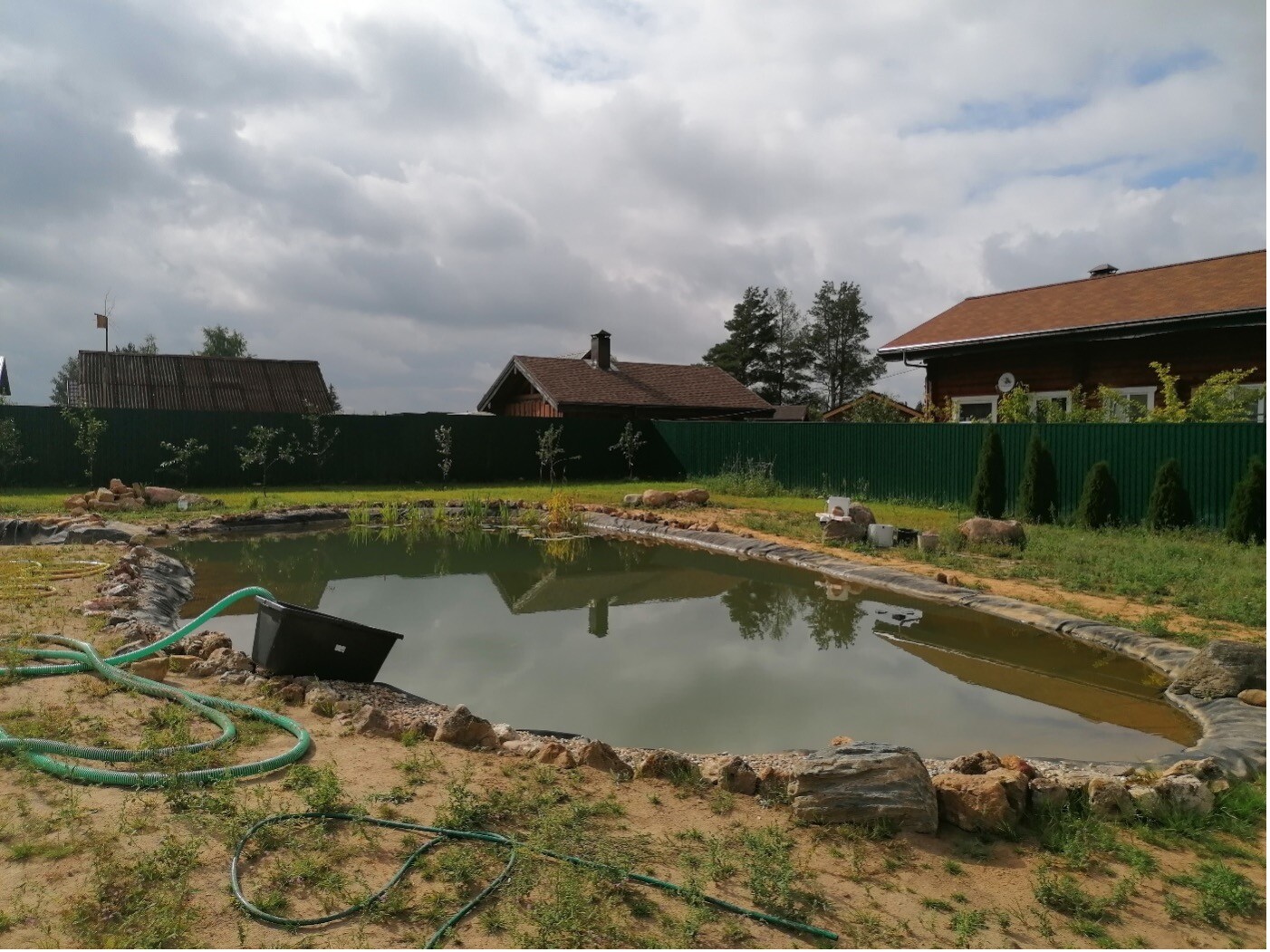 Создали водоем на участке загородного дома. Вся работа сделана с нуля, от выкопки под водоем до укладки камня по контуру.