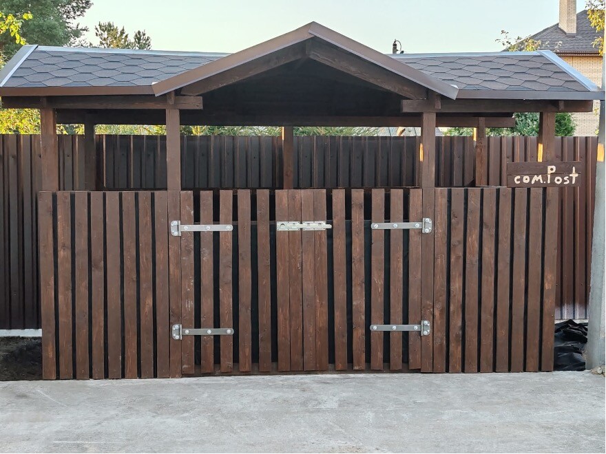 Установили стилизованный в дизайн участка сарай для хранения компоста