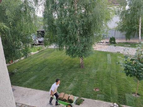 Провели работу по укладке газоне "с нуля". Земляные работы, выравнивание площадки, подбор и посадка газона.