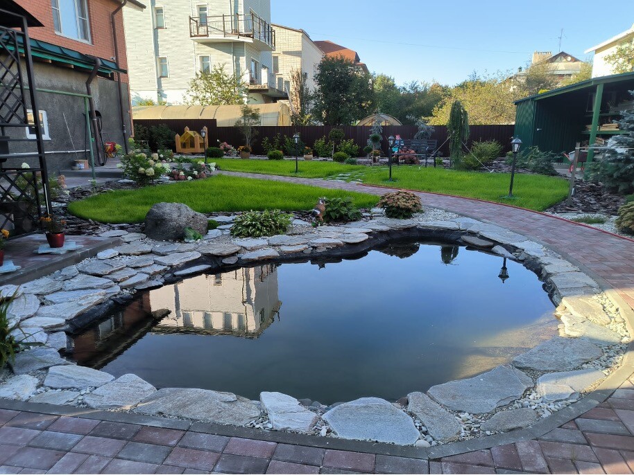 Создали водоем на участке загородного дома. Вся работа сделана с нуля, от выкопки под водоем до укладки камня по контуру.